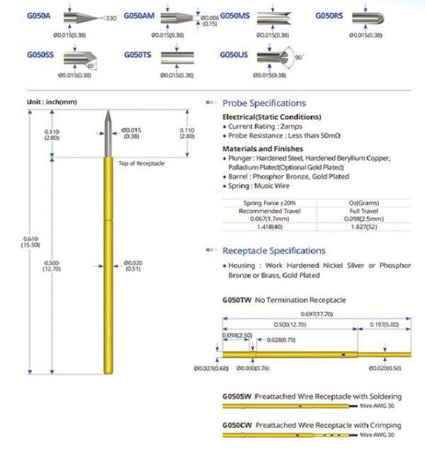 G050 Probe pin series có các loại đầu khác kết hợp như: A, AM, MS, SS, TS…