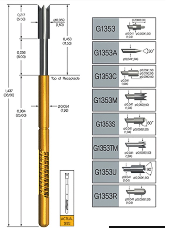 G1353A PROBE PIN có kiểu đầu tiếp xúc là: đầu nhọn góc 30 độ
